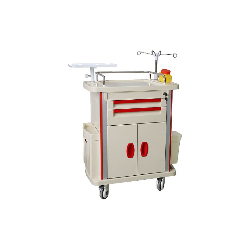 6) Sliding side shelf, dust basket, Needle disposal holder, IV pole, Defibrillator shelf, Oxygen tank holder, CPR board, Power outlet & Hooks, Utility container