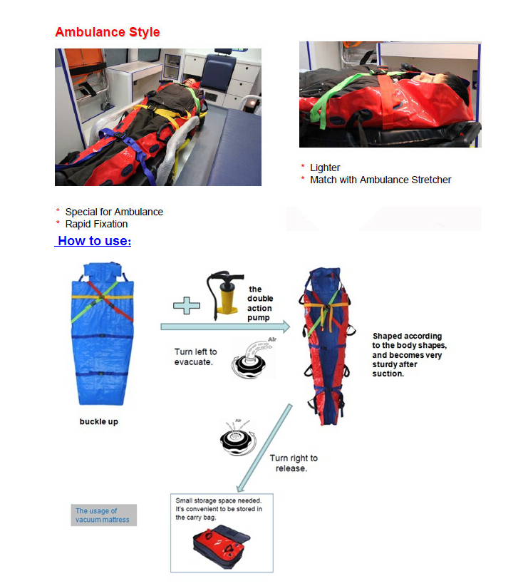 The vacuum mattress is made of high quality resistant seamless welding TPU material with small form particles inside. It's X-ray translucent.