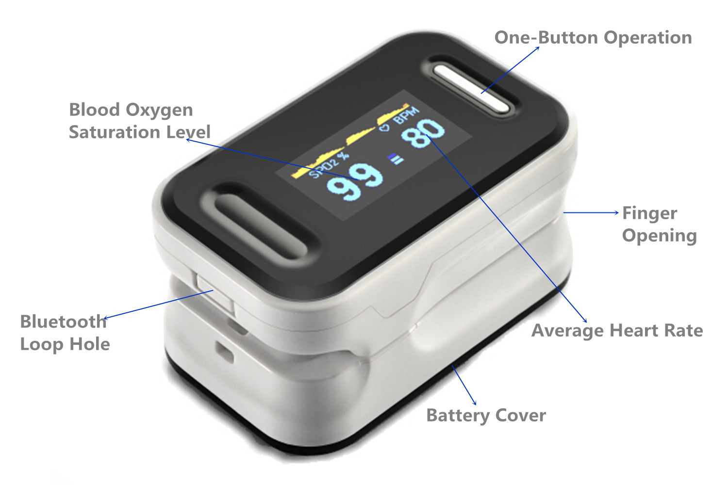 The Finger Oximeter is configured color OLED, whose UI shows the Spo2 and PR parameter, and the Power indication and the Pulse beat icons. Ideal used by clinicians, patients, caregivers and consumers. For spot-check applications in personal health and wellness, homecare, hospital and clinics, outdoor activities